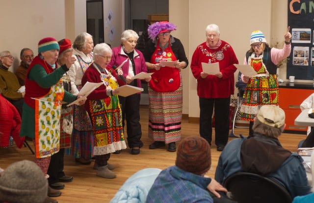 Participants were very happy to be able to warm up in the church basement with a coffee or tea and snack of crackers, cheese and cookies provided by the long time famous Raging Grannies of Lethbridge.