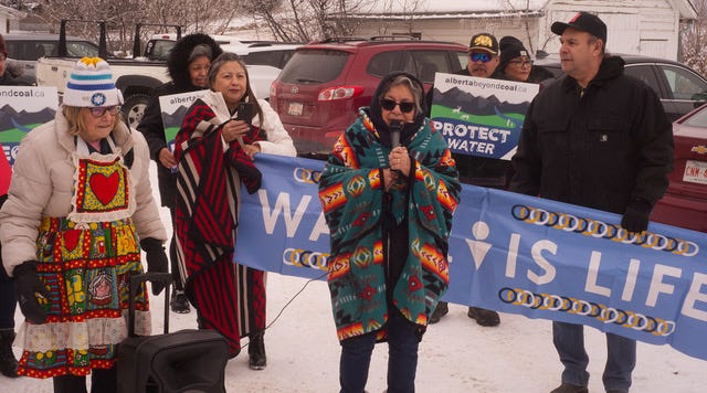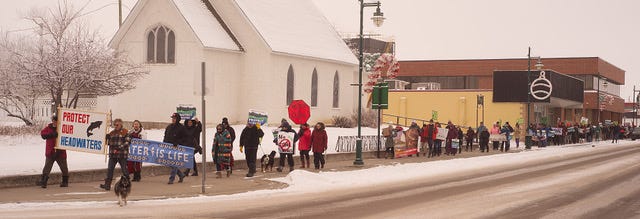 I’m happy to say that our protest march against Grassy Mtn. yesterday in Pincher Creek was a huge success. I was really hoping to see a 30 person turn out. Much to my surprise and delight, we had close to 200 people show up with signs and enthusiasm, despite the -14C temperature. Some attendees came from distances as far as Lethbridge and Calgary, which is where event organizer Nicole Johnston and her husband, Hugh, travelled from.